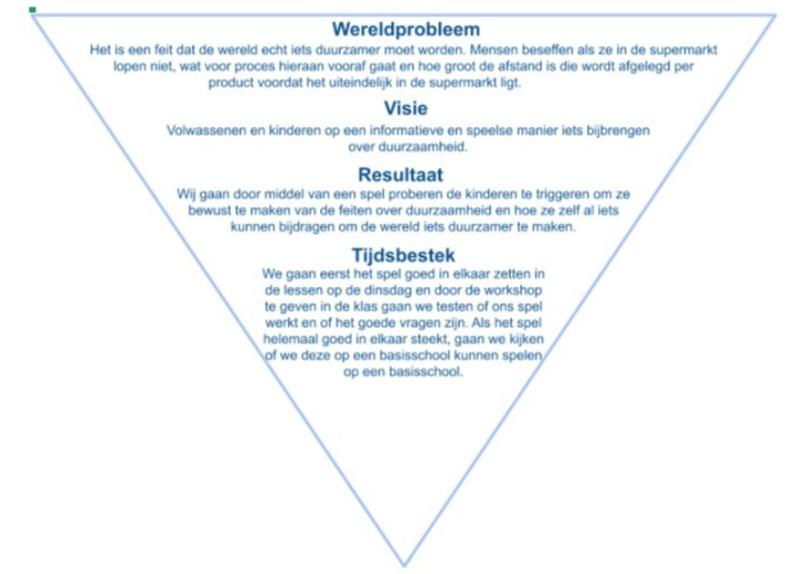 Een duurzaamspel waardoor kinderen leren wat duurzaamheid inhoudt, verschillende weetjes, stellingen en leuke vragen om de kennis te testen die ze misschien al hebben. Wij hebben dit spel in de vorm van ganzenbord gemaakt. Als je met een dobbelsteen gooit en je komt op een vakje, dan lag het aan het vakje of je een vraag moest beantwoorden of niet. We hebben dit spel ook geoefend tijdens een workshop in de klas. We hebben toen aan iedereen gevraagd of ze goed en kritisch wilden kijken naar ons spel en of ze verbeterpunten zagen.